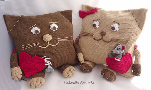 Машинная вязка (РАБОТЫ И СХЕМЫ)У меня снова связались милые подушки кошки. Размер 35*35 см. Чехлы на молнии для удобства стирки, конечности на пуговках съемные. Пряжа полухлопок. Основа машинная вязка, отделка и допы крючком.