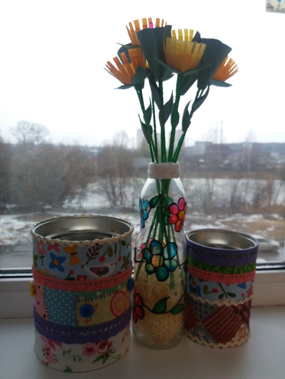 Поделки с детками.В саду попросили сделать поделку на тему-Вторая жизнь вещей.Сотворилась такая вот ваза с цветами.Ваза-это бутылка из-под сока,рисунок нанесла с помощью красок для витража.Цветы сделаны из яиц от киндера,стебель-шпажка декорированная лентой.Другие цветы вырезаны из коробки от яиц,также на шпажке,декорированные лентой.Листья вырезанны из этой же коробки,тычинки-шпажки для канапе.