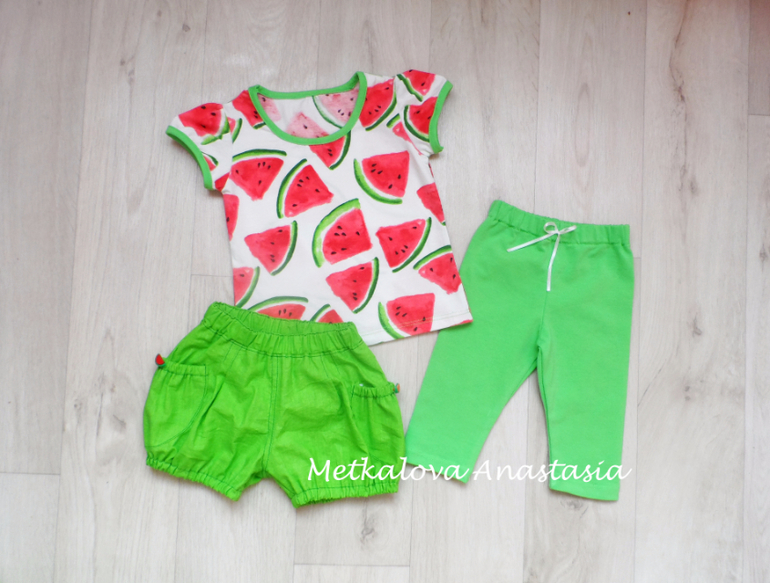 футболка из кулирки, а шорты из футера с лайкорой. Уже даже не помню, что за выкройка, из запасов откопала