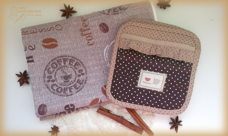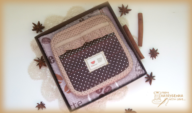 Как уже сказала, в комплект к прихватулям пошила полотенечко с "ароматом кофе"))