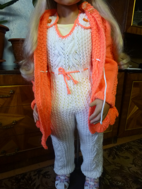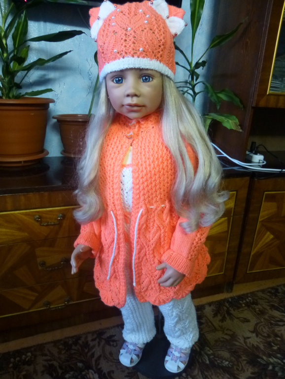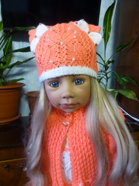 Хотела связать дочке, но т.к. вязала на глаз, то немного ошиблась в расчетах и комплектик получился великоват. Поэтому, вместо дочи его примеряет ее подружка)))