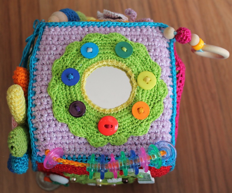 Тут у нас цветочек с пуговками цвета радуги, а в серединке зеркальце, девчачья же игрушка, надо будет и полюбоваться))) А также можжевеловые колечко с бусинами погрызть и пластмассовые колечки погромыхать, поперебирать)