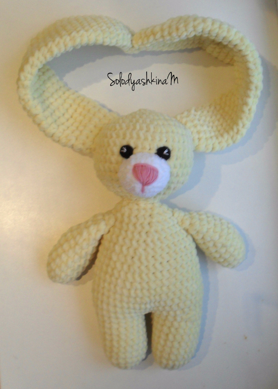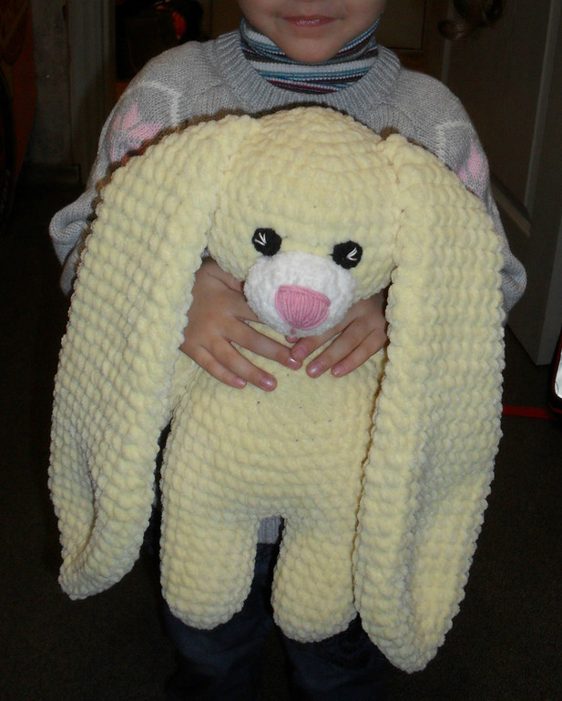 Амигуруми (вязаные игрушки)Совесть меня совсем замучила и добралась таки я до просьб дочки. Пока что это как она и просила большой заяц. Одно из списка можно вычеркнуть. Хотя не знаю куда ей еще в кровати и так места из-за игрушек уже нет. Получился прям огромный. без ушей 34 см.