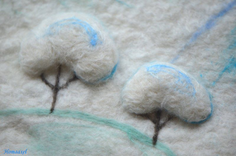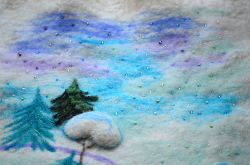 Панно на стену "Снежная зима". Шерсть, шерстяные декоративные нити, японский бисер. Основа - мокрое валяние, весь рисунок - сухое валяние.