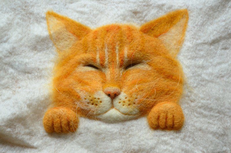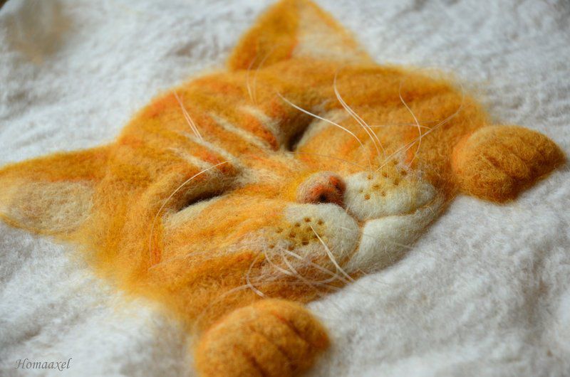 Основа - мокрое валяние, рисунок - сухое валяние, набит иглой. Усы из лески. Кот размером 18х20 см.