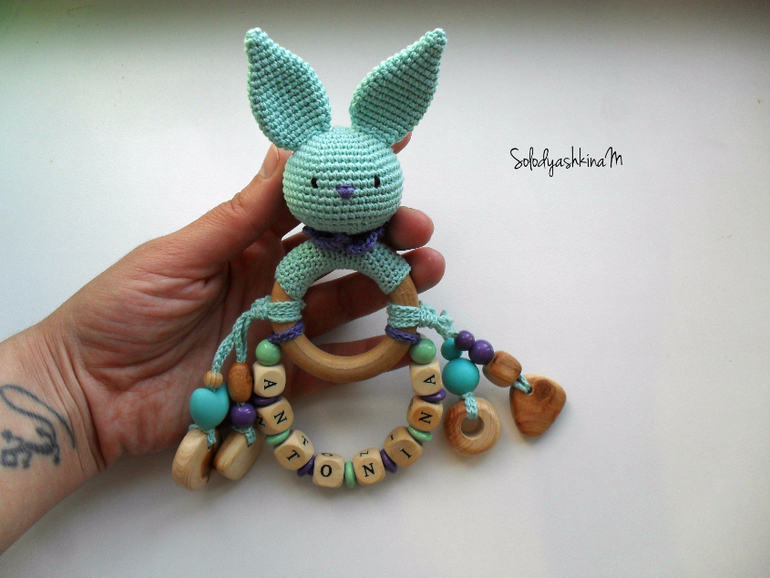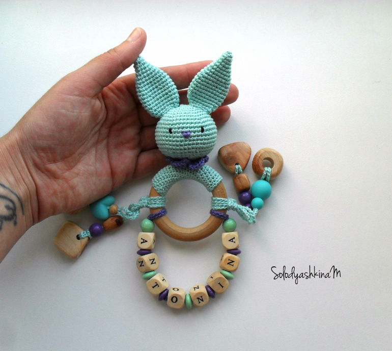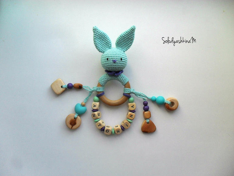 Бижутерия для слингомам. Слингобусы. Грызунки.Держатель я уже для малышки этой делала и последний мой лавандовый заяц тоже для нее. Теперь готова такая вот вязаная игрушка-грызунок или развивашка даже не знаю. один словом гибрид )))) Оооочень мне нравится имя у малышки.