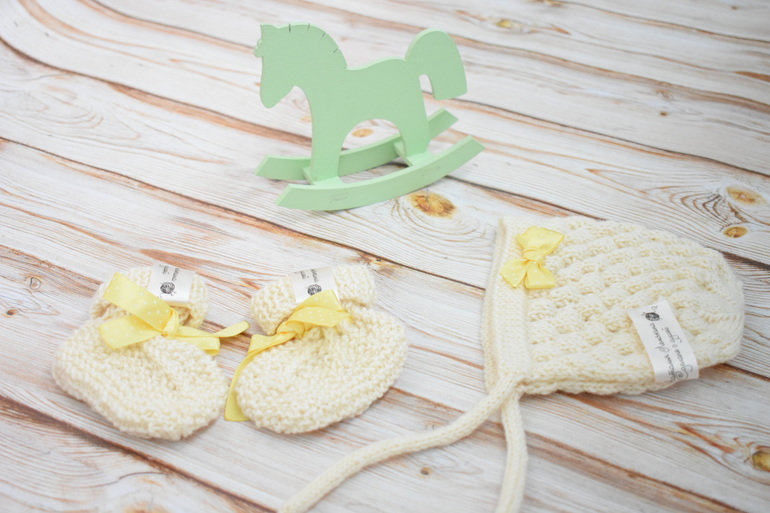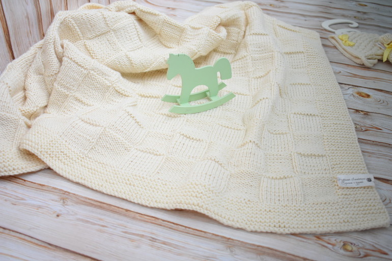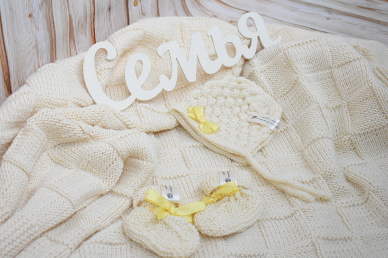 Комплект состоит из пледа, пинеток и чепчика. Связан спицами из пряжи созданной специально для деток. ✔Состав пряжи: 40%-шерсть, 20%-бамбук, 40%-акрил.