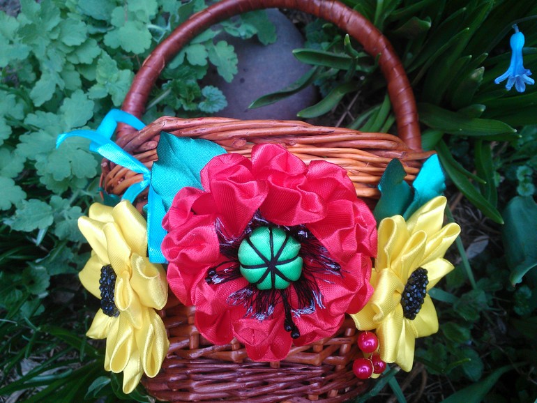 Цветы из ткани и форма. Канзаши. Украшения для волос.Решила украсить корзинку для своих девочек на пасху.Сделала композицию с цветами канзаши съемную для удобства.Мак и два цветочка на подобии подсолнуха.