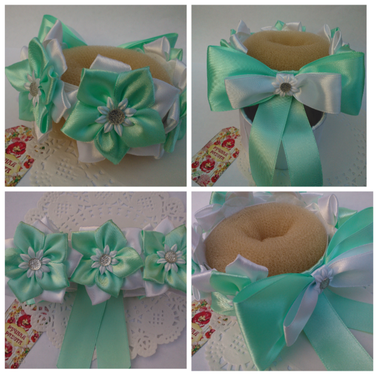 Цветы из ткани и форма. Канзаши. Украшения для волос.Украшение под выпускное платье для девочки в мятном цвете. Под срезом еще одно фото.