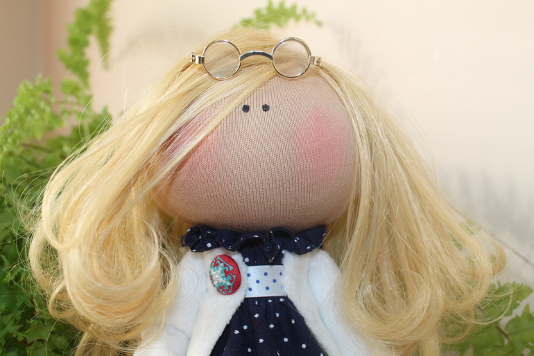 А пальтишко на цветной шёлковой подкладке. И замшевые ботиночки с белыми шнурками, которые продеты в люверсы. Всё выполнено мною (кроме очков, конечно).