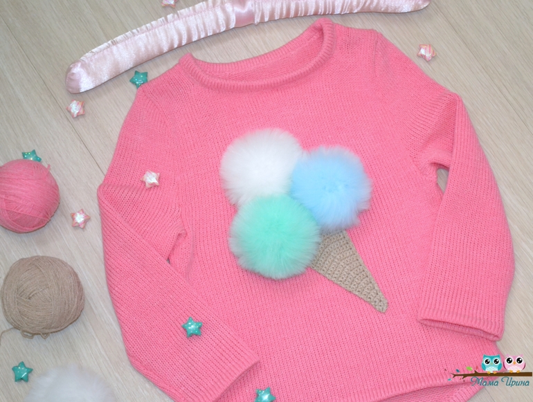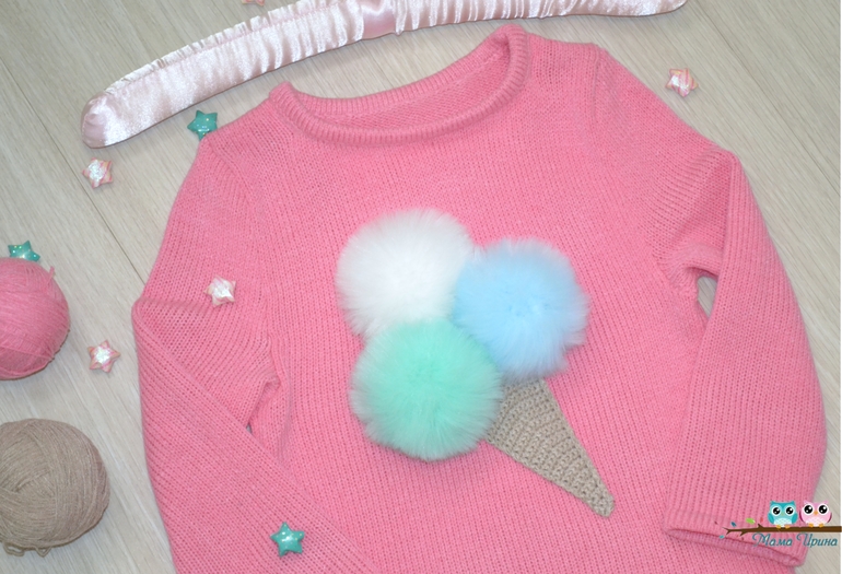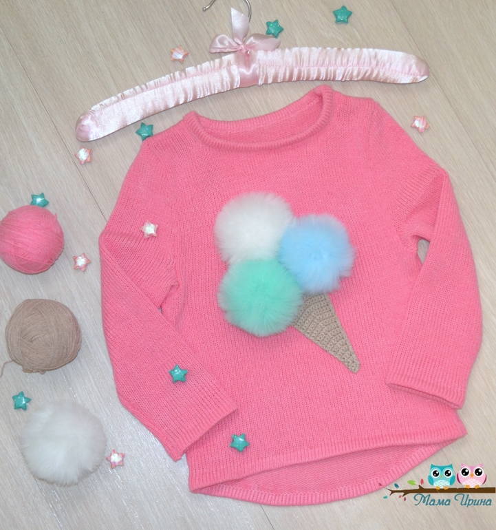 Благодарю, Надюша! Мне в таком цветовом решении тоже больше нравится...такой и была первоначальная задумка, но девчушка 4 лет для себя одобрила с красными помпонами...ей и ушел джемпер с малиновым мороженым, а этот мятно-сливочный рожок поедет к моей крестнице))