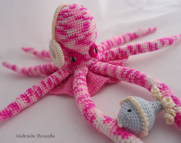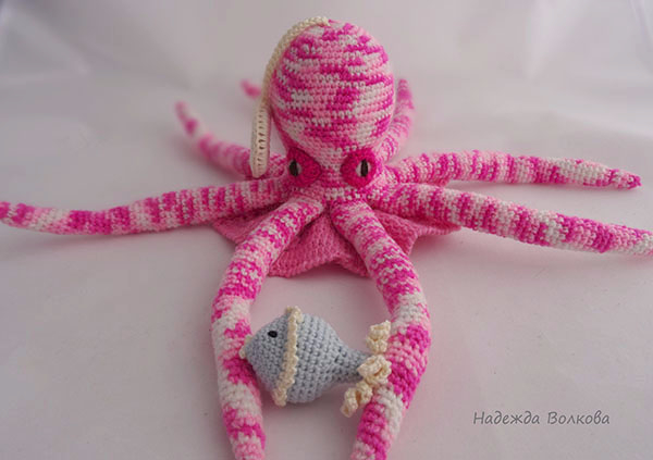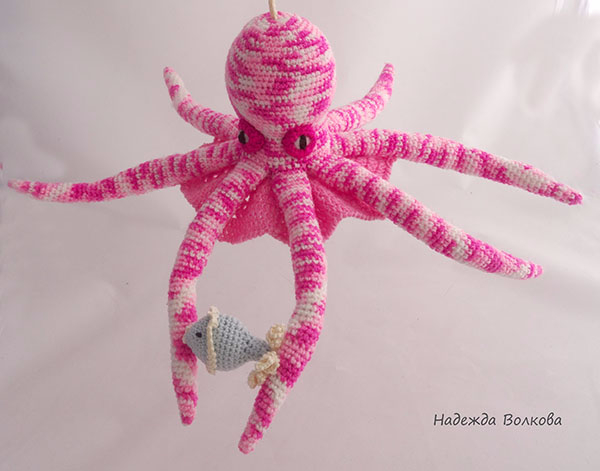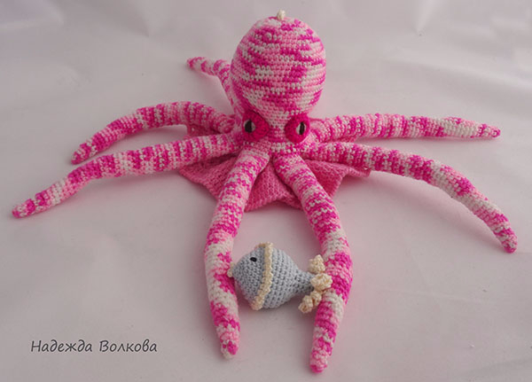Амигуруми (вязаные игрушки)Связался еще один морской житель по МК Александры Simba. Высота головы 8 см, щупальца в диаметре 35 см. Каркас делать не стала, так как предназначен для игр малышей. В голове гремелка в рыбке пищалка. Пряжа неизвестного происхождения, крючок 1,25, глаза привалены.