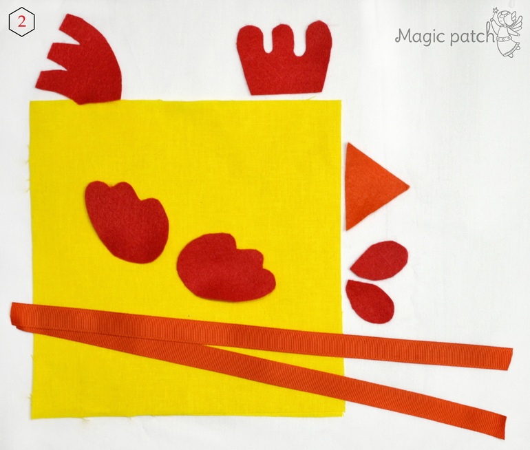 Фетр красный и желтый/оранжевый для гребешка, хвоста, клюва, сережек. Желательно жесткий, но можно и мягкий.