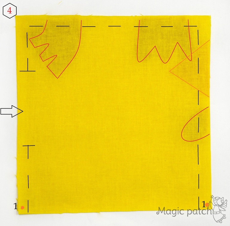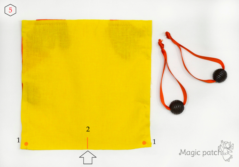 5. Наверное, самое сложнообъясняемое место. Непрошитую сторону квадрата надо сложить, соединив друг с другом швы(точки 1), в таком случае точки 2 будут располагаться по бокам, в эти места как раз вшиваем "ноги" - можно использовать просто ленты, ленты с бусинами или пуговицами. (см.фото 5 и 6). Прострачиваем этот шов.