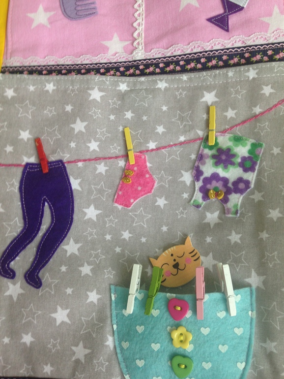 У нас на шкафчиках нет крючков, а сверху мешается полочка, поэтому такая колбаса) там наверху два плоских кармашка для платочков или для секретиков))
