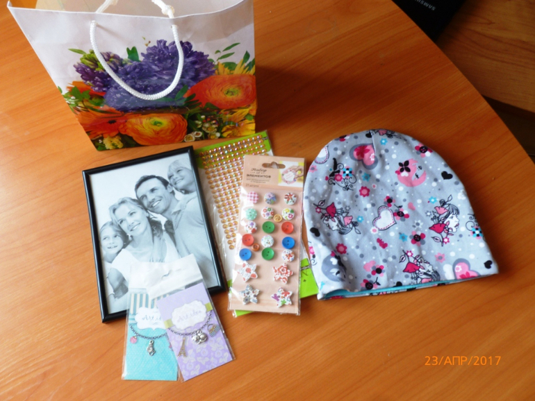 а в нем фоторамка, набор страз, набор пуговок, 2 подвески и шапочка, еще были леденцы, но ребятишки сразу же их съели :))) и замечательная шапочка :)
