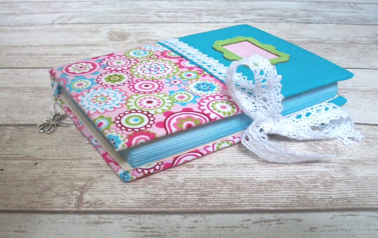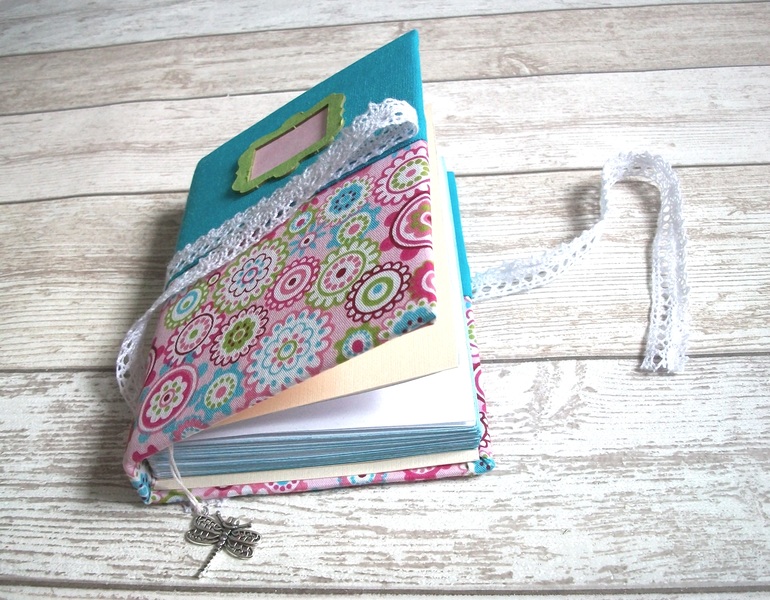СкрапбукингБлокнот ручной работы "с нуля". Переплет и каптал выполнены вручную. Обложка сделана из плотного картона, оформлена хлопковой тканью с мягкой подложкой, что делает блокнот тактильно приятным. В рамочку можно добавить надпись. Наполнение блокнота: 90 белых не линованных листов, тонированных пастелью с торца, в тон обложке. Размер 15*10 см, поместится в любую сумочку, удобно носить с собой. Завязывается на тесьму. Есть закладка из хлопкового шнура с металлической подвеской в виде стрекозы. Очень яркая и позитивная вещица))
