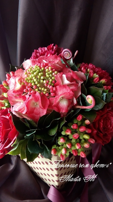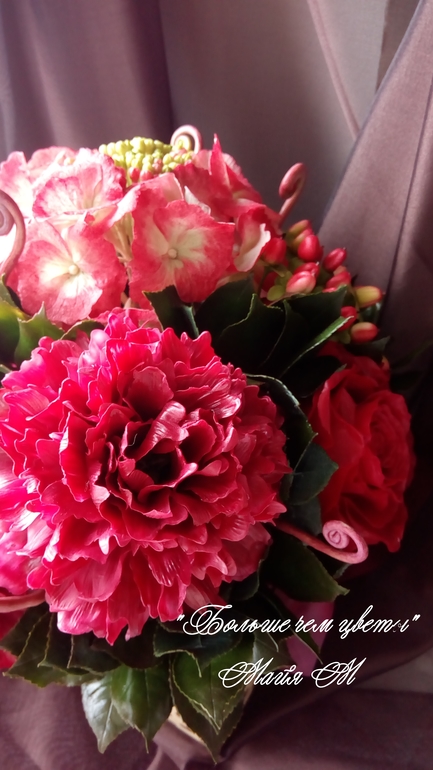 Композиция получилась большая 35 см в высоту и в обхвате 91 см. Все цветы выполнены в реальную величину с проработкой всех мельчайших деталий. Холодного фарфор. Полностью ручная работа.![]()