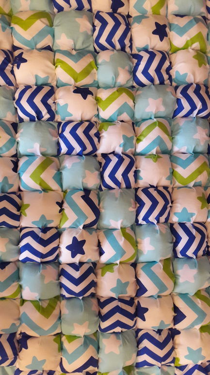 Если внутрь набивать утеплитель плотно, то оно будет теплое. А если еще и слой однородный холофайбера подложить- еще теплее) оно в итоге получается тяжеловатым. Но мне так и нужно, чтобы ребенок не раскрывался ночью. Вторым применением этого одеялка может быть подстилка. Коврик для игр. Чтобы попа не мерзла например сидя на траве. Я его и планирую летом в манеж и на траву стелить.