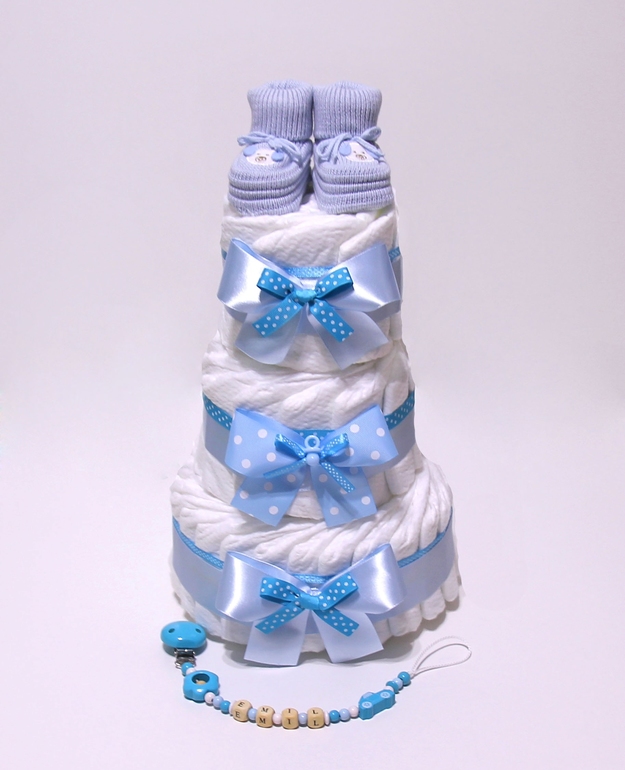 Торты из памперсов, букеты из детских вещей - оригинальные подарки на рождение.