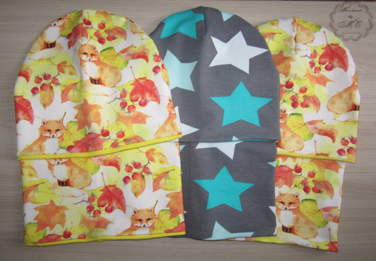 Пора шить юбочки и панамки)))) А у меня все шапочки да снуды, чуть-чуть разбавлены повязочками. Материал футер, рибана. Декор термонаклейки. Под кат более 5 фото.