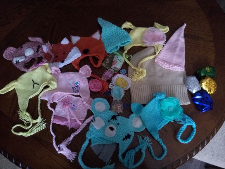 Обмены подарками, материалами для рукоделия (хвастики)Мой шапочный маньяк просто а восторге! Вот такой ассортимент всевозможных шапуль навязала мне Света. И на этот раз шапочка есть и у меня😏, не все одним куклам красоту носить!))