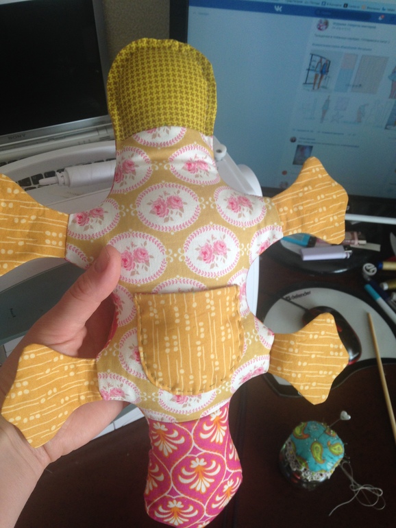 Карман добавила от себя. Что за утконосик без кармашка?! Встала в 6 часов, дошила, натолкала колечек в карман и подложила спящей Махе)