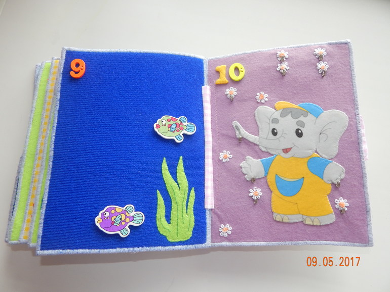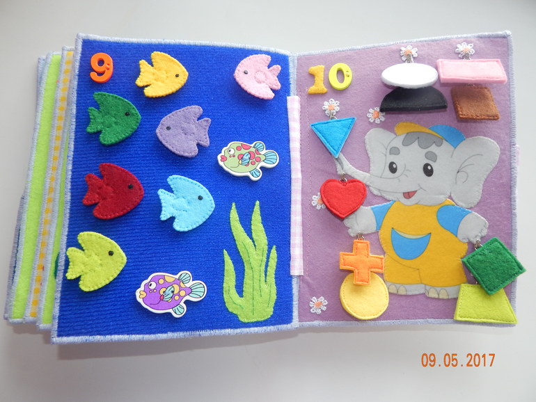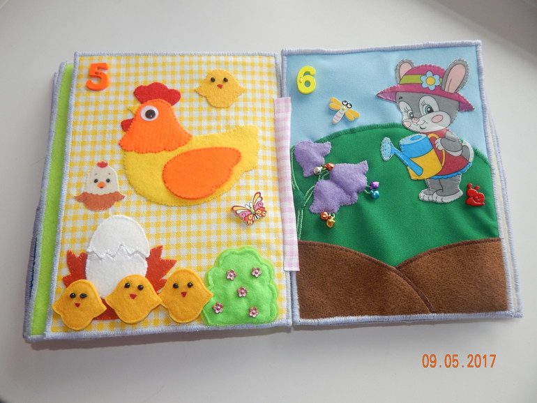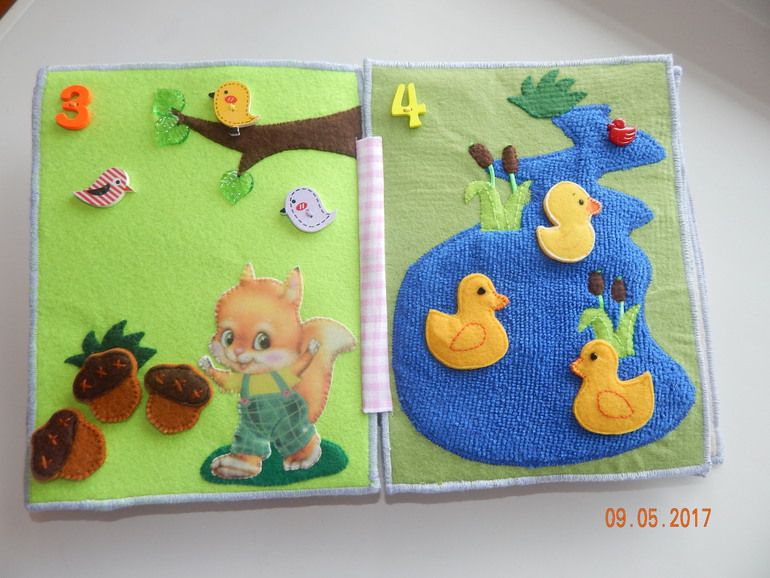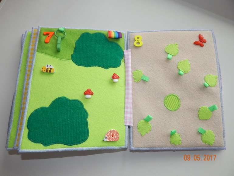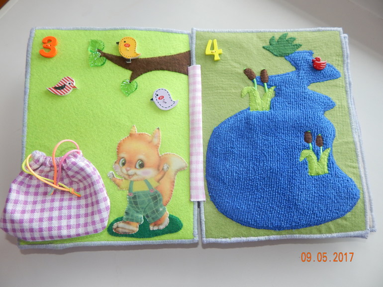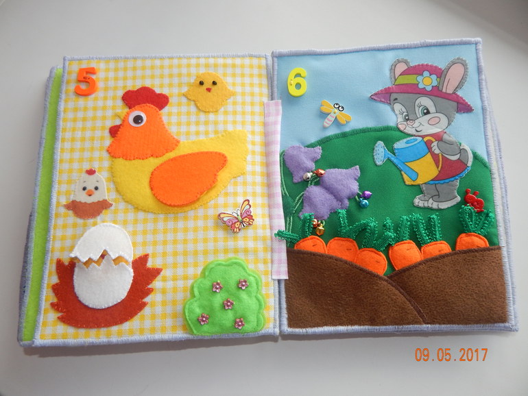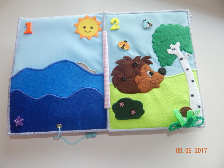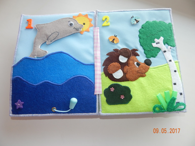 Развивающие игрушкиСшита книжка из фетра и ткани, размер 15*20 см. Использованы различные виды застежек. Закрывается книжка на магнитную кнопку. Съемных деталей 43 шт. 5 разворотов.