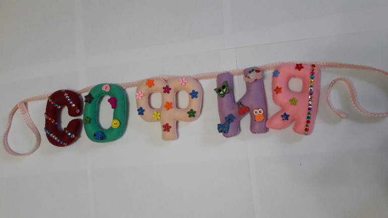 ФетрДд! Сшила подруге для ее доченьки.Надеюсь понравится😊первая моя растяжка из фетра, шила оочень долго.Самое сложное для меня было выбрать декор для буковок.еще сделала держатель для пустышки.Как Вам??