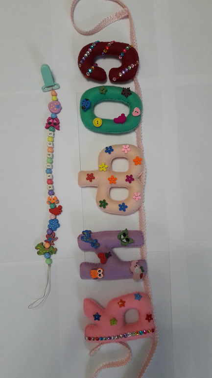 Дд! Сшила подруге для ее доченьки.Надеюсь понравится😊первая моя растяжка из фетра, шила оочень долго.Самое сложное для меня было выбрать декор для буковок.еще сделала держатель для пустышки.Как Вам??