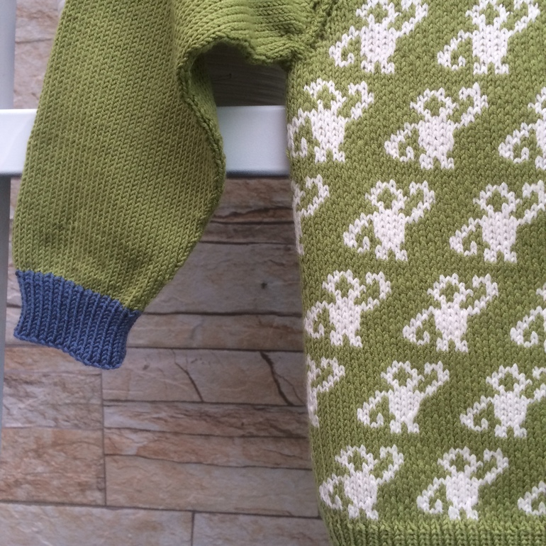 Вязание спицамиДомучила свитерок для коллегиной внучки (два года), чего-то он мне никак не шёл - сначала долго думала как вязать так, чтобы регланом сверху, как я люблю и не сшивать, потом прибавки в реглане не правильно рассчитала, довязав до разделения на тушку и рукава (ниточка тоненькая и промахнулась). В общем вот результат.