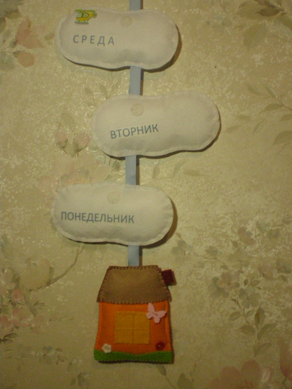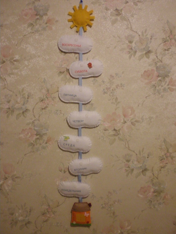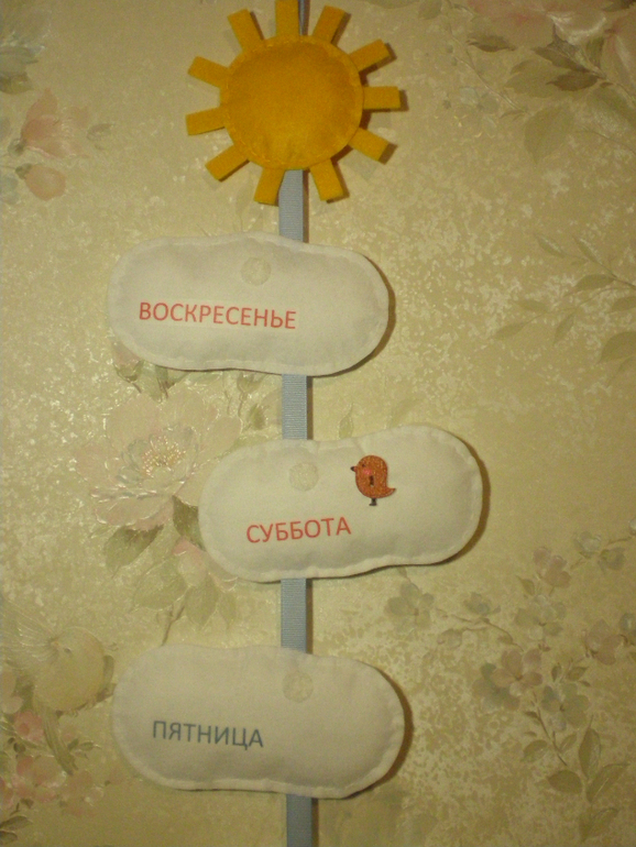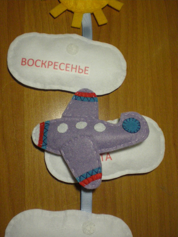Пошито из фетра, наполнитель облаков синтепух. Названия дней недели переведены с помощью термотрансферной печати.