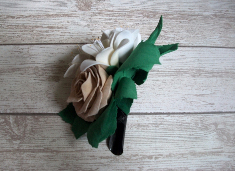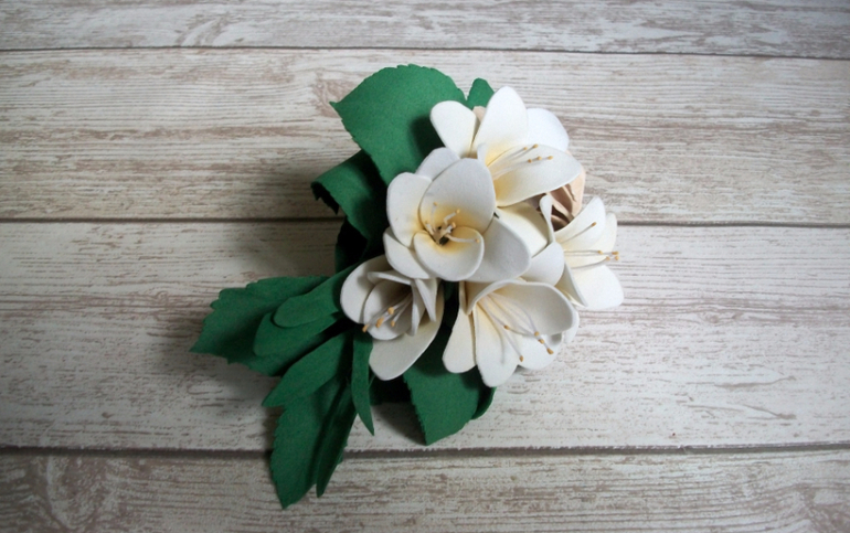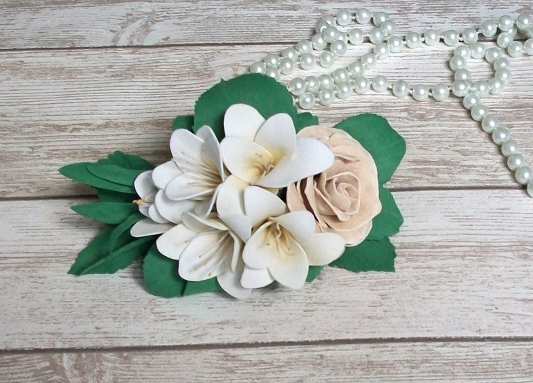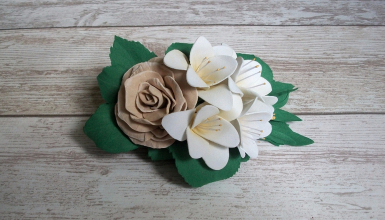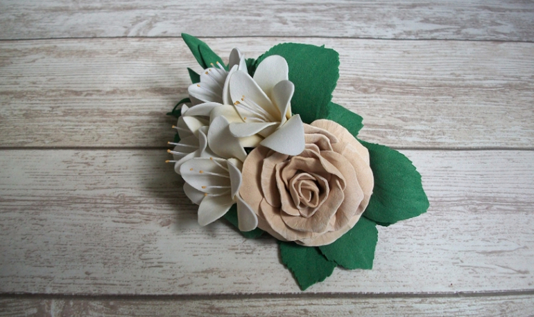 Цветы из ткани и форма. Канзаши. Украшения для волос.Невероятно нежный и нарядный аксессуар для волос из фоамирана, в виде розы песочного оттенка и белой фрезии. Композиция закреплена на металлический зажим, длинной 12 см.