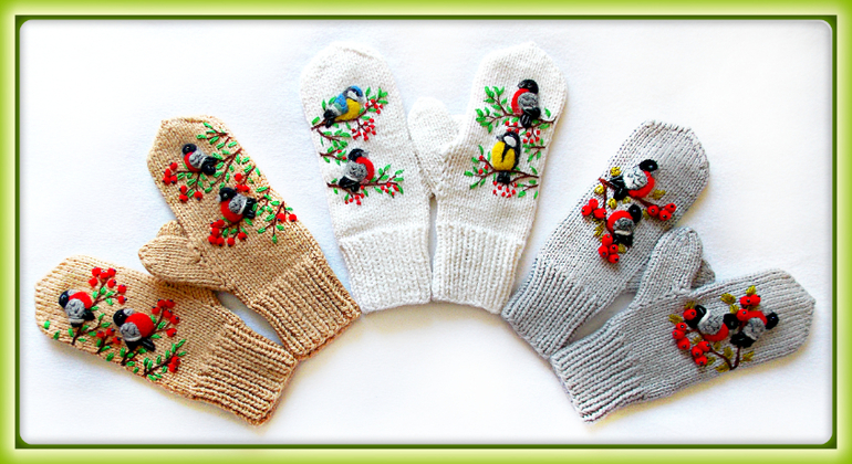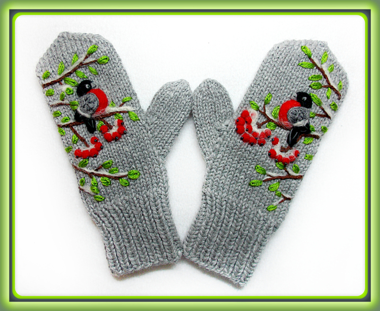 Вязание спицамиЯ все вяжу свои снегирьковые рукавички)) Вроде бы один рисунок, а все получаются разными)) Как Вам кажется?