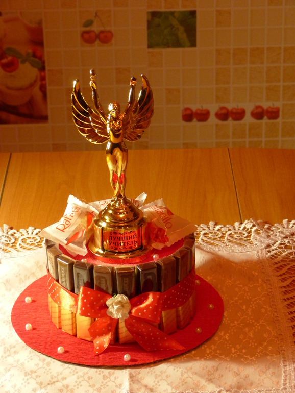 Букеты из конфет. Свитдизайн.Уже завтра у дочери последний звонок, вот и пролетели 4 года учёбы. Очень захотелось порадовать любимого учителя лично от себя, сотворился такой тортик. Основа - круглая коробка конфет "рафаэло", вокруг - шоколад "мерси", ну и декор. Под катом 4 фото.