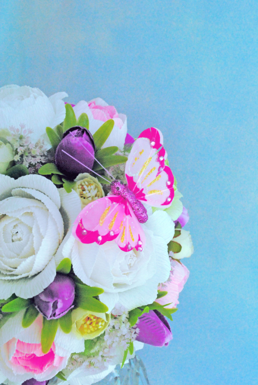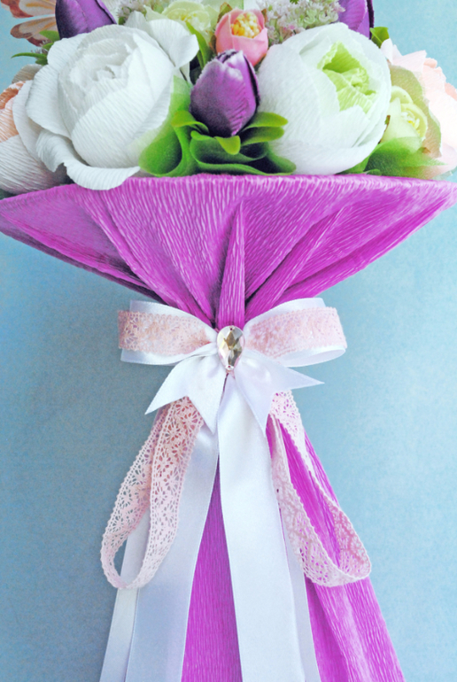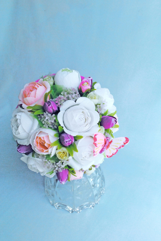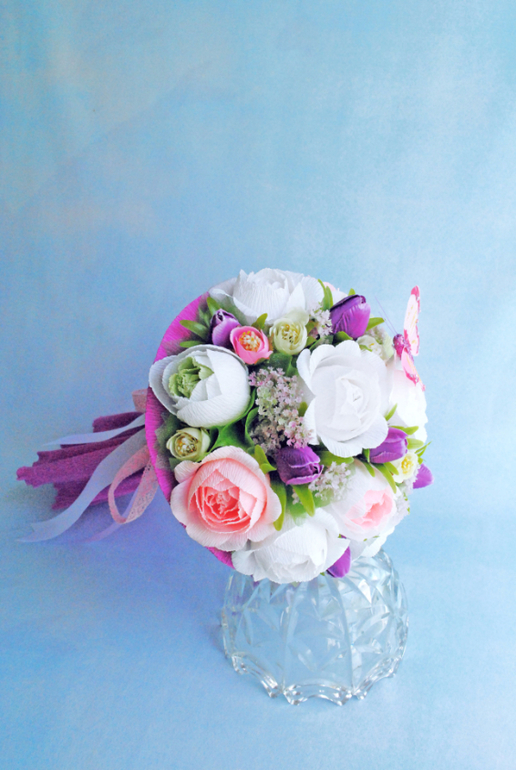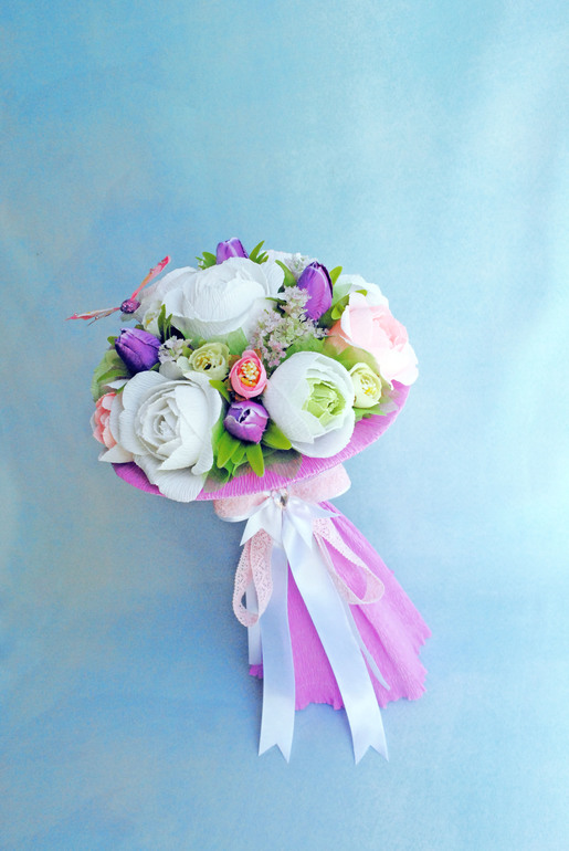 Насмотрелась на всякую свежатинку-нежнятинку и родился у меня вот такой букетик. С розовой бабочкой, кружавчиками и тюльпанчиками.