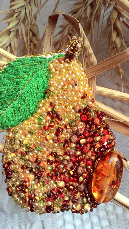 Оооо, груша очень здоровская! Мне кажется, было бы ещё интересное фото, когда брошь локазана на одежде. И чуть мельче фото, в смысле, чтобы вокруг броши было бы какое-то пространство.