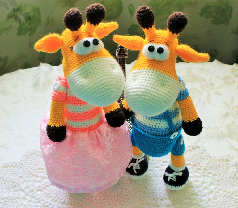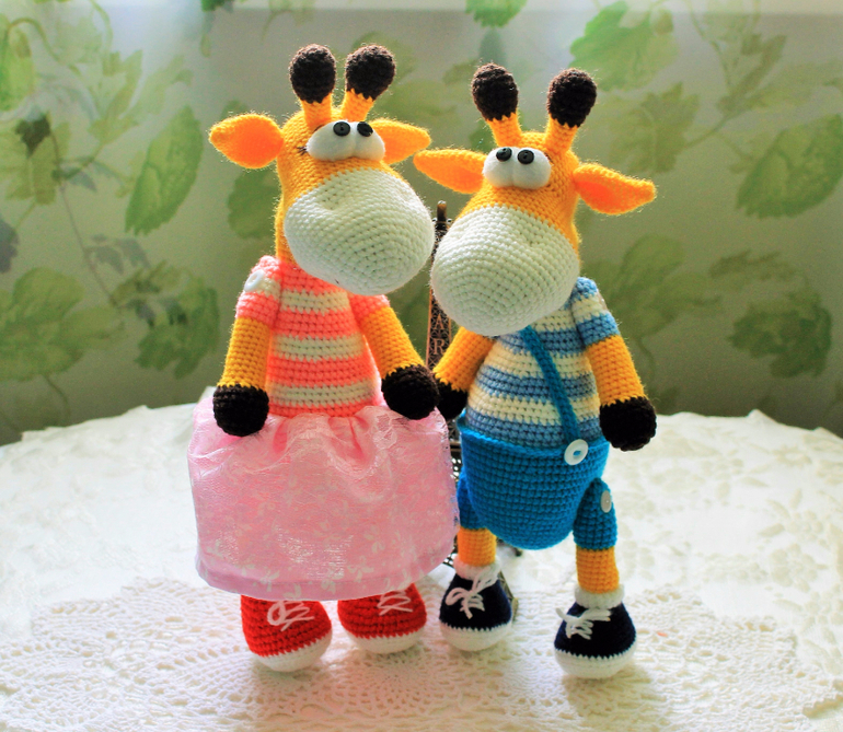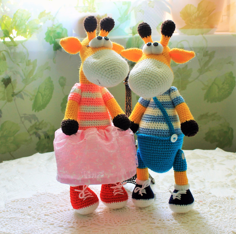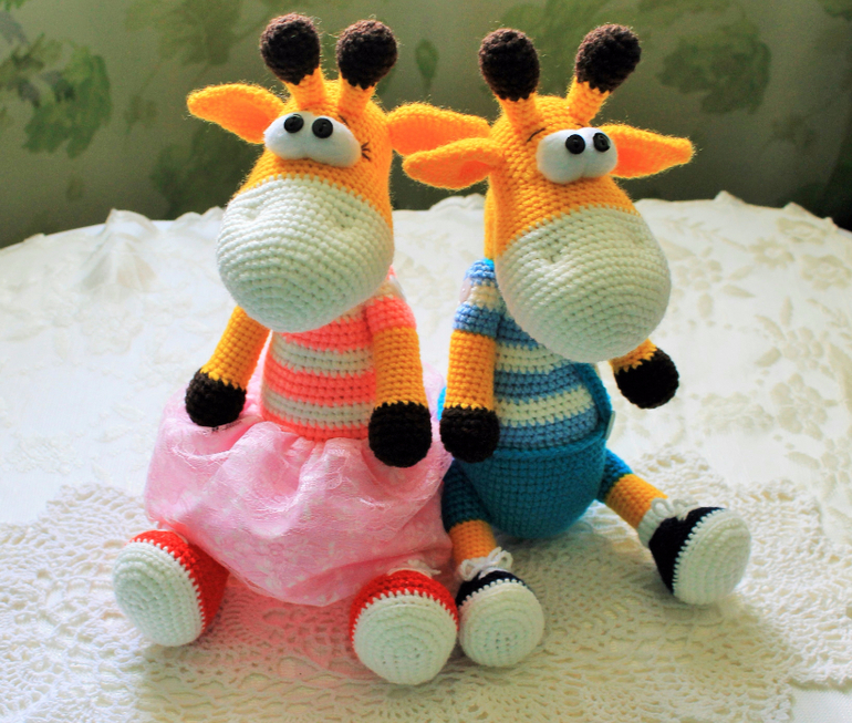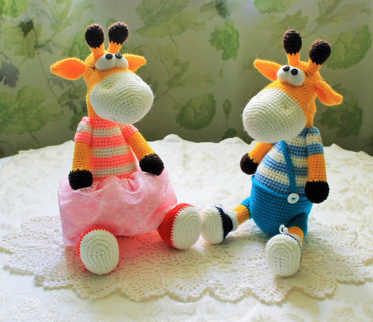 Игрушечный мир - животныеЭти жирафики связаны по МК Марии Устюшкиной (из ВК), получились ростом 35 и 36см, девочка чуток обошла мальчика ))) Стоят с опорой, сидят самостоятельно, ручки-ножки на пуговичном креплении. Пряжа - акрил, наполнитель - холлофайбер