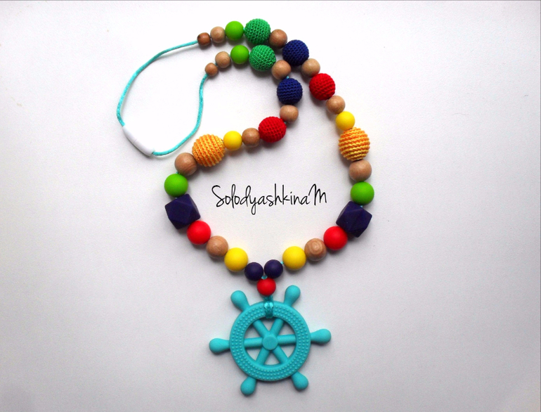 Бижутерия для слингомам. Слингобусы. Грызунки.Май был продуктивный. Одна из работ. Малышу особенно приглянулся грызунок-штурвал. Что собственно и не удивительно, на мой взгляд одна из самых удачных форм силиконовых грызунков. Выпирающие ручки штурвала по форме напоминают соску хоть и меньше размером, плюс на круге "пупырышки", идеально и чтобы обсосать и чтобы погрызть.
