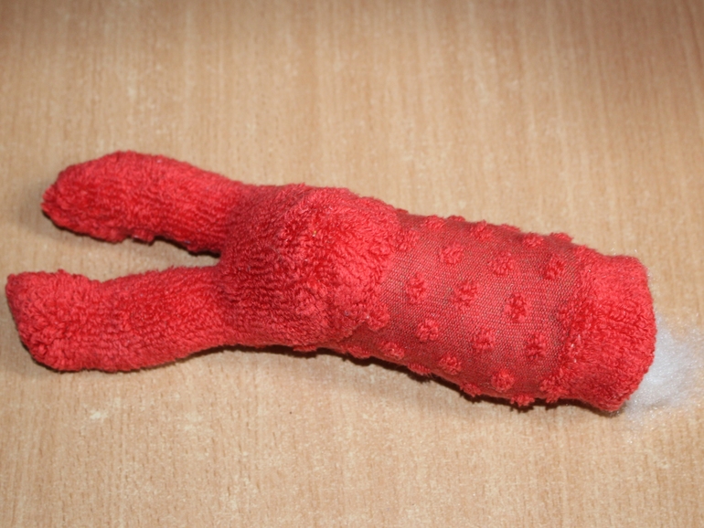 Теперь изделие нужно набить синтепоном или синтепухом. Старайтесь пяточку заполнить наполнителем как можно плотнее, тогда мордочка зайчика будет более выразительная.