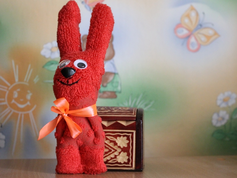 И последним штрихом в изготовлении нашей игрушки из носка своими руками будет милый бантик из атласной ленты, который мы повяжем на шею зайчика. Вот и все игрушка готова!