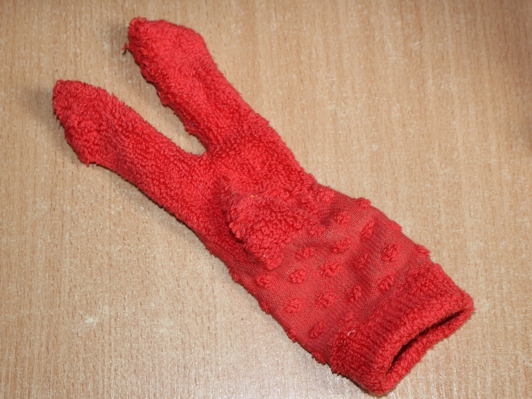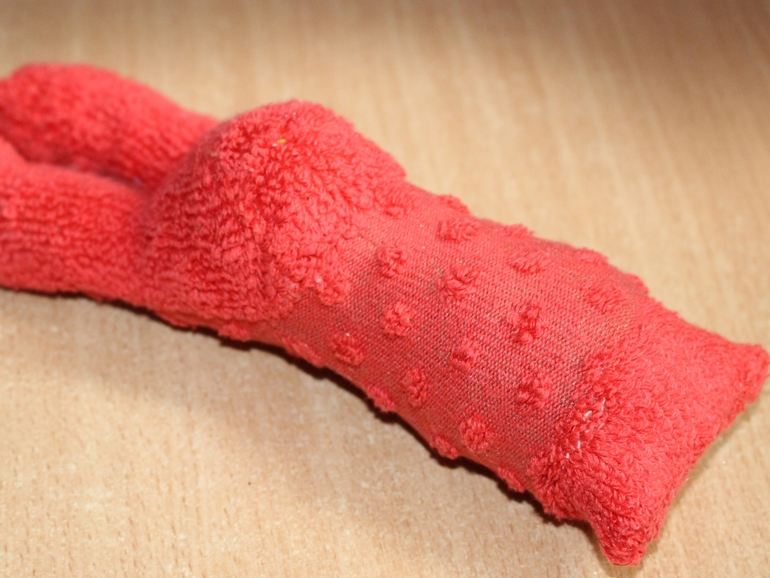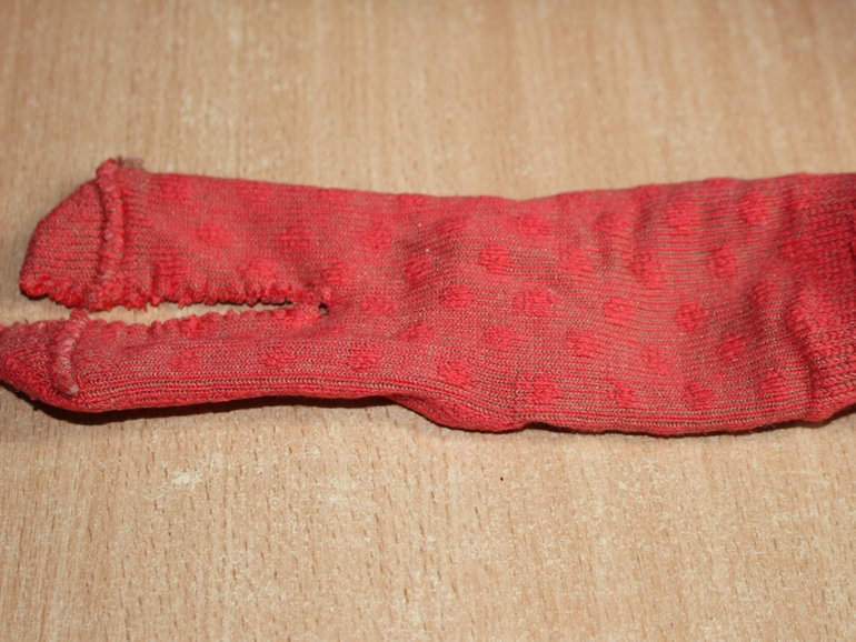 Где у носка пяточка - будет мордочка зайчика. А там, где у ноги располагаются пальчики, будут ушки. Для начала надо расстричь кончик носка на две ровные половинки. Так же, как у меня на фото.