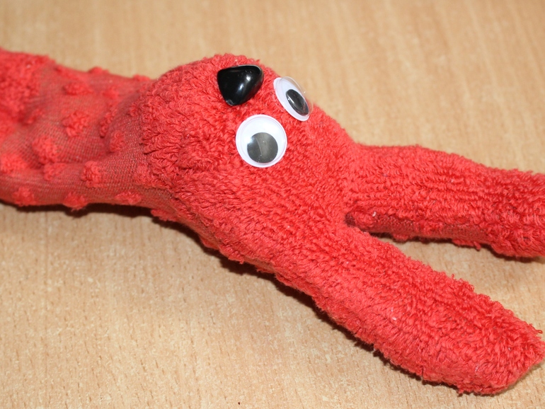 Теперь нам нужно сделать ножки и ручки. Для ножек, прокладываем вертикальный шов, в нижней части носка, длиной примерно 3-4 см.