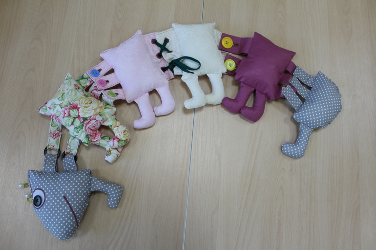 Принцип игрушки заключается в освоении детьми основных видов застежек. Играя в ... нее, детки при этом развивают моторику своих ручек. Так как при создании «Сороконожки» мне не удалось зафотографировать все этапы, в этой публикации я все го лишь покажу конечный результат, где поподробней остановлюсь на самих застежках.