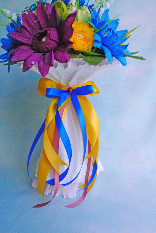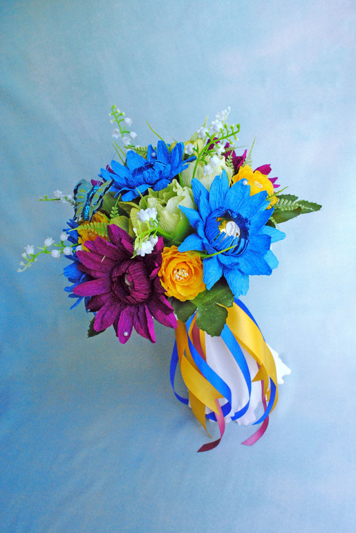 сотворился у меня букетик-растрёпыш. Такой весь непричёсанный и взрывной. Цветовая гамма тоже неоднозначая. В декоре использовала искусственные ландыши, камелии и две орхидейки. Прошу к просмотру фото.
