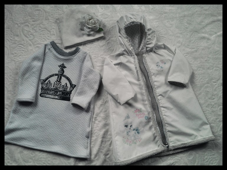Выкройки все с оттобре, платье и плащ шила по одной выкройке, с прибавками. Шапочка трикотаж, а роза с фикс Прайса. Вот зачем то я её пришила, и не подумала о стирке... На платье термотрансфер с короной, а на плащике сублимация.