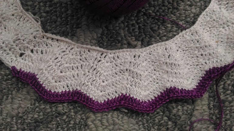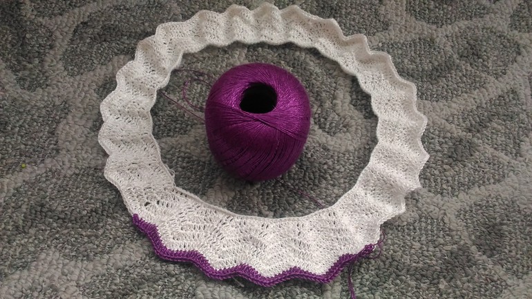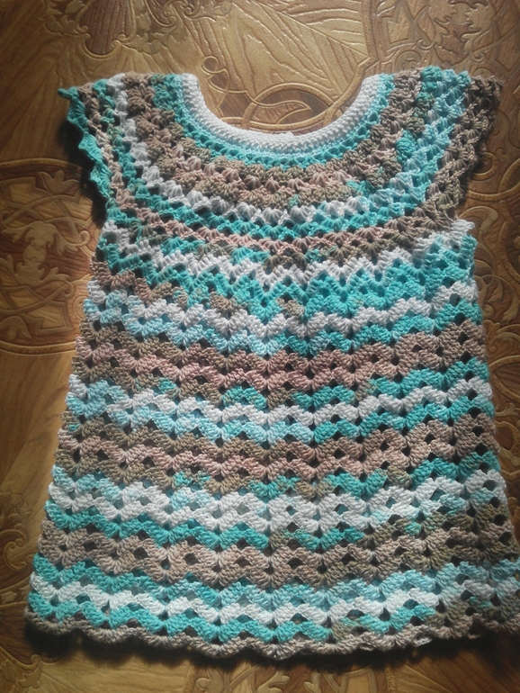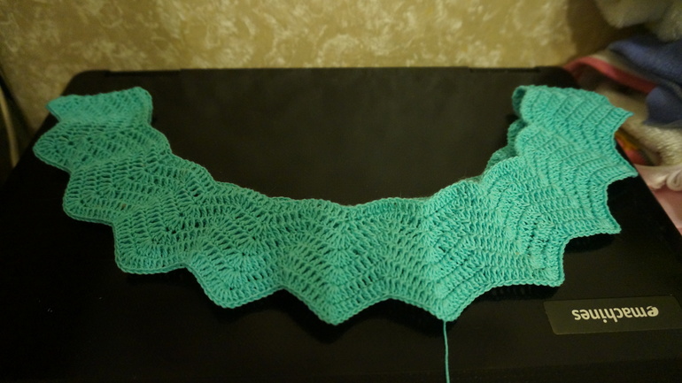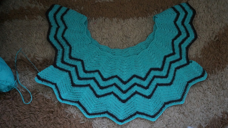Начав вязать поняла, что углы у горловины мне не нравятся, поэтому отошла от схемы и первый ряд был сбн. Зигзаги пока сглажены, за счет первого ряда, но думаю позже заострятся.