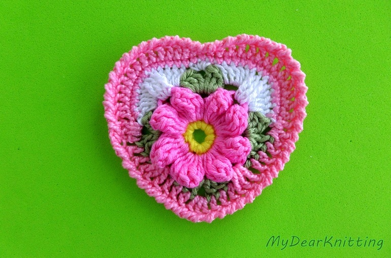 Оригинальное вязаное сердечко. За основу взят японский цветочек, большая часть вяжется по принципу бабушкиного квадрата. Затем обвязка рачьим шагом. Все очень просто, тем не менее, работа выглядит отлично. Мастер-класс в Ютубе (русские субтитры).