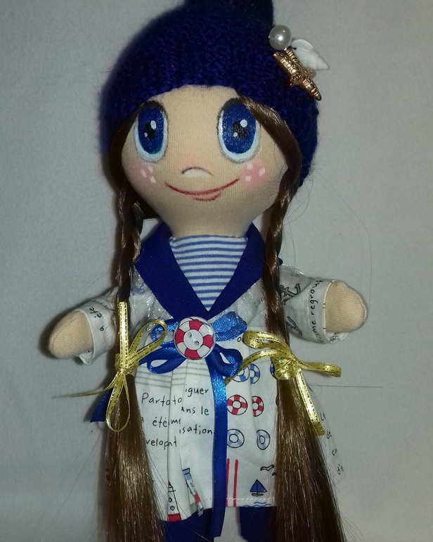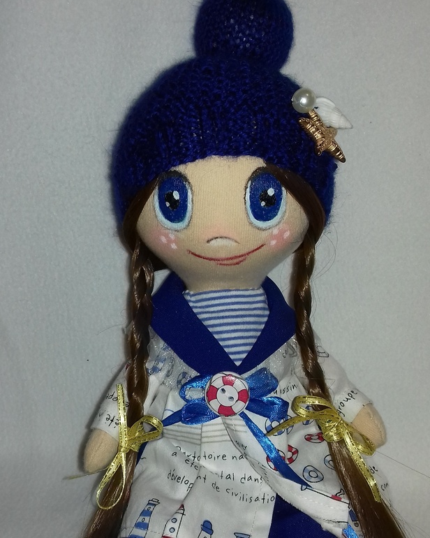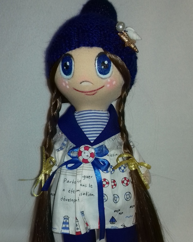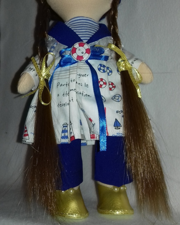 Вы сочетали когда нибудь несочетаемое. Хотя тут как посмотреть... золотые туфли и синий комплект одежды навевает мне воспоминания о золотом песке и синем море. Кукла сделана в подарок для маленькой девочки. Она игровая, можно расчесывать и заплетать. Одежда сделана из хлопка, шапочка связана из п/ш пряжи. Обувь тоже ручной работы.