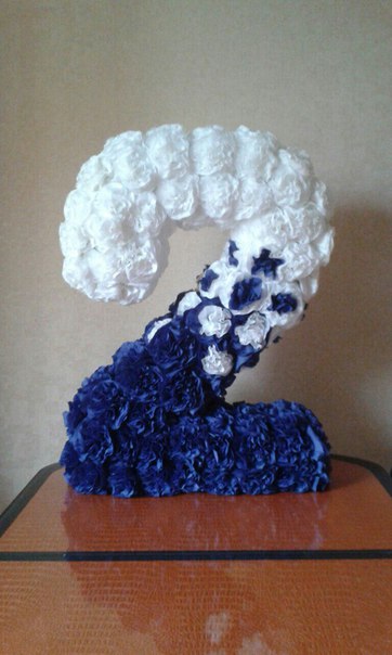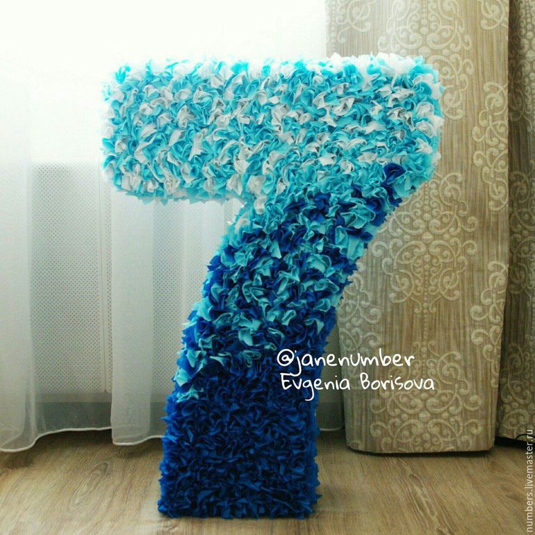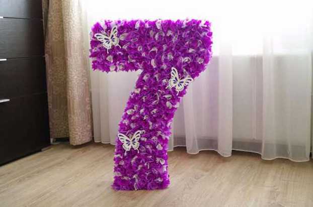 Для начала Вам нужно определиться - цифра семь (основа) будет объёмной или нет. Если объёмной - вырезать лучше из пеноплекса или вырезать из гофрокартона несколько семёрок, а после склеить. Либо вырезать из картона в 3D, т.е. внутри она будет полая. Если семёрка будет плоской, то двух-трёх слоёв гофрокартона будет достаточно. После определиться с цветом. "Бутончики" сделать более пышными. Можно сделать типа цветов или воспользоваться торцеванием. Для этого можно использовать не только салфетки. Органза тоже подойдёт. Кстати, с органзой будет быстрее, говорю по опыту). Приклеивать к основе более плотно, тогда Ваша семёрочка порадует не только именинника, но и гостей).